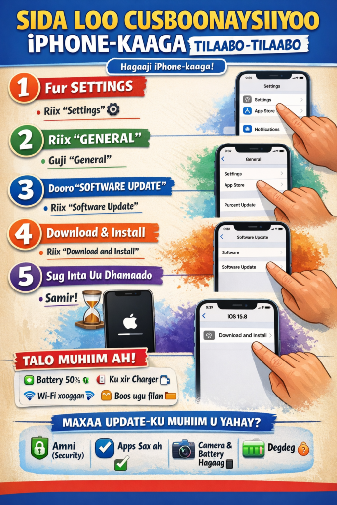 Cusboonaysiinta iPhone-ka (iOS Update) waa arrin muhiim u ah amniga, xawaaraha, iyo shaqada guud ee taleefanka. Dad badan ayaa haysta iPhone, balse ma oga sida saxda ah ee loo update-gareeyo ama sababta ay muhiim u tahay. Maqaalkan wuxuu si cad kuu barayaa sida loo cusboonaysiiyo iPhone-kaaga talaabo talaabo, adigoon aqoon farsamo u baahnayn.