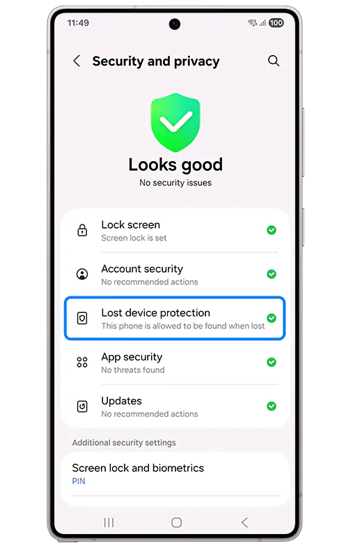 • Taabo Samsung Account ee kore, kadib gal Security and privacy > Lost device protection.