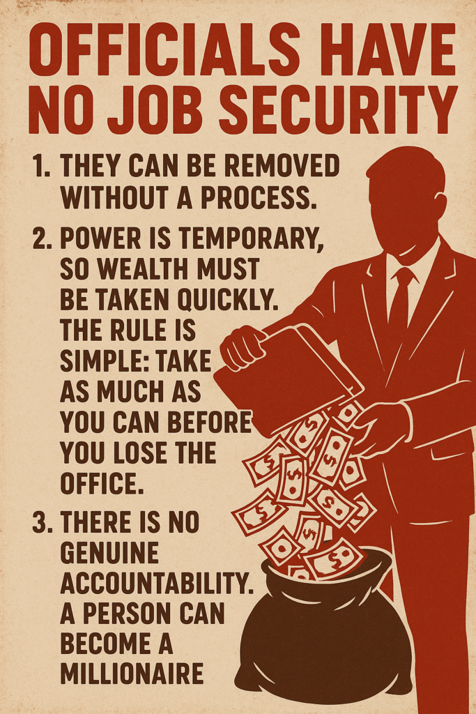 Power is temporary, so wealth must be taken quickly. The rule is simple: take as much as you can before you lose the office.
