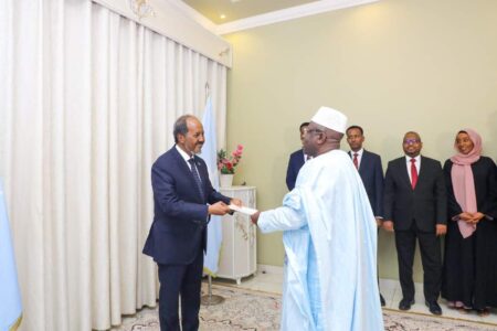Madaxweynaha Jamhuuriyadda Federaalka Soomaaliya Mudane Xasan Sheekh Maxamuud ayaa maanta warqadaha aqoonsiga Danijirenimo ka guddoomay Safiirrada Lix dal, kuwaas oo Soomaaliya ay u soo magacaabeen dalalka Guinea, Ireland, Romania, Spain, Switzerland iyo Zambia.